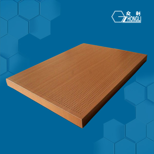 沖孔吸音蜂窩鋁板的構造結構為穿孔面板與穿孔背板,依靠優(yōu)質膠粘劑與鋁蜂窩芯直接粘接成鋁蜂窩夾層結構,并且在鋁蜂窩板背板貼上一層吸音無紡布。由于蜂窩鋁板內的蜂窩芯分隔成眾多的封閉小室,阻止了空氣流動,使聲波受到阻礙,提高了吸聲系數(可達到0.9以上),同時提高了板材自身強度,使單塊板材的尺寸可以做到更大,進一步加大了設計自由度。可以根據室內聲學設計,進行不同的穿孔率設計,在一定的范圍內控制組合結構的吸音系數,既達到設計效果,又能夠合理控制造價。通過控制穿孔孔徑、孔距,并可根據客戶使用要求改變穿孔率,最大穿孔率<30%,孔徑一般選用∮2.0、∮2.5、∮3.0等規(guī)格,背板穿孔要求與面板相同,吸音布采用德國科德寶的無紡吸音布等吸聲材料。
